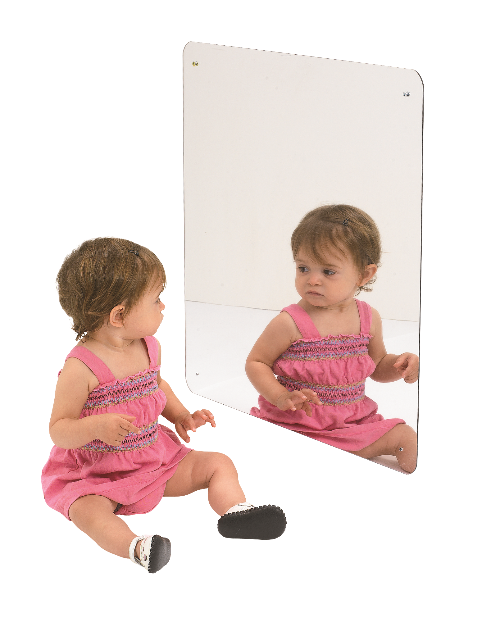 Shatter-resistant acrylic wall mirror adds a new dimension to creative play. Promote facial recognition. Fastens easily to wall with screws (included). Safe rounded corners. 60 cm Sq.