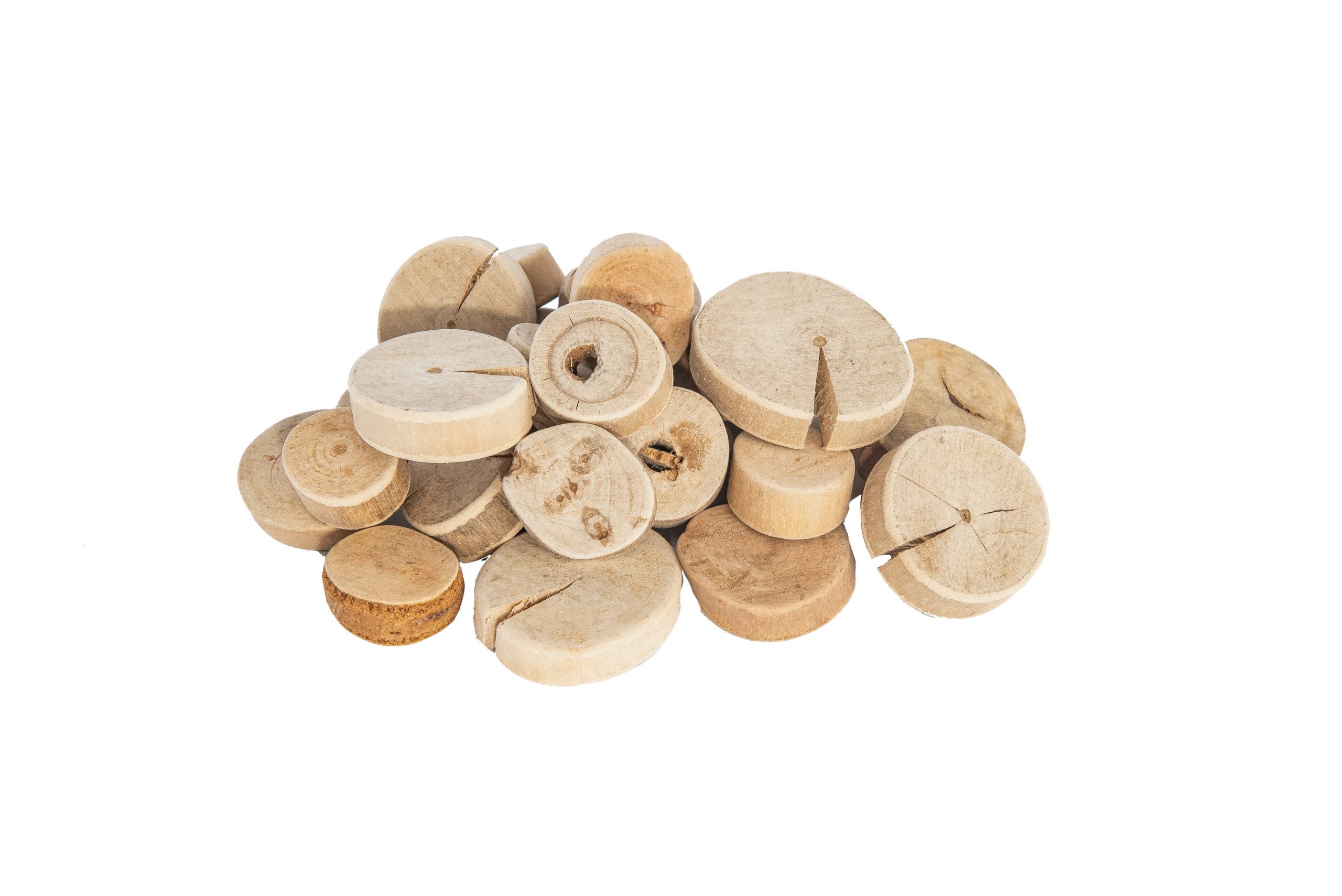 Wood slices vary in size, 2 cm – 4 cm W, 2 cm -4.5 cm L. Each wood slice has a thickness of about 1 cm. Approx. 160 pieces.
