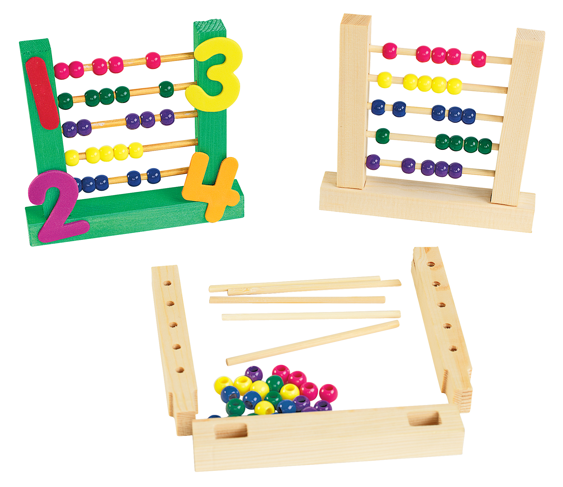 These miniature abacuses are a great introduction to the classic math tool. Wooden abacus kit comes with 8 wood pieces and 25 plastic beads per abacus. Easy to assemble with no glue or tools required. Pine wood abacuses may be decorated with markers, paint, collage materials, and more. Finished abacus measures 13 x 2 x 13 cm. Includes beads in blue, fuchsia, green, white and yellow.