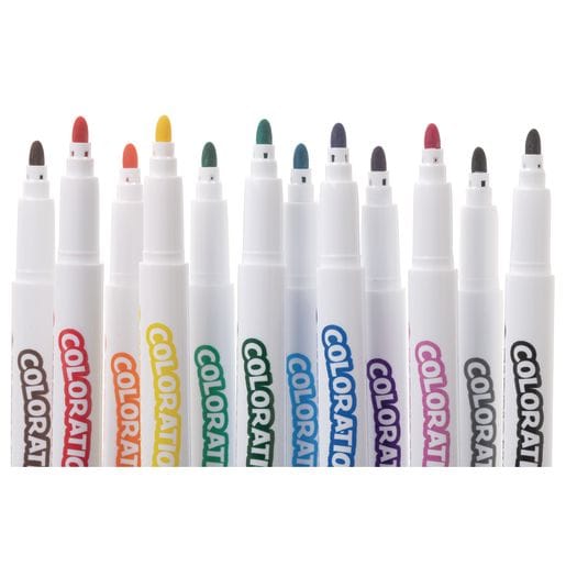 Colorations Fabric Markers allow you to create stunning designs on cotton or cotton blend fabrics. You get a set of 24 permanent fabric markers. Each marker measures 13,5 cm in length by 1 cm in diameter. Each nib is 0,5 cm in diameter. Markers come in 12 unique vibrant colors. You get two of each black, blue, brown, gray, green, magenta, orange, red, spruce, turquoise, violet, and yellow. Colorations permanent ink is long lasting and non-washable. Use with adult supervision. Colorations fabric markers can be used on many surfaces. Use on any canvas or cotton blend fabric to create your own design. All Colorations brand products are non-toxic and safe for children. Does not contain latex, dairy, casein, egg, peanuts, gluten, tree nuts, or soy. ASTM-D4236 certified.