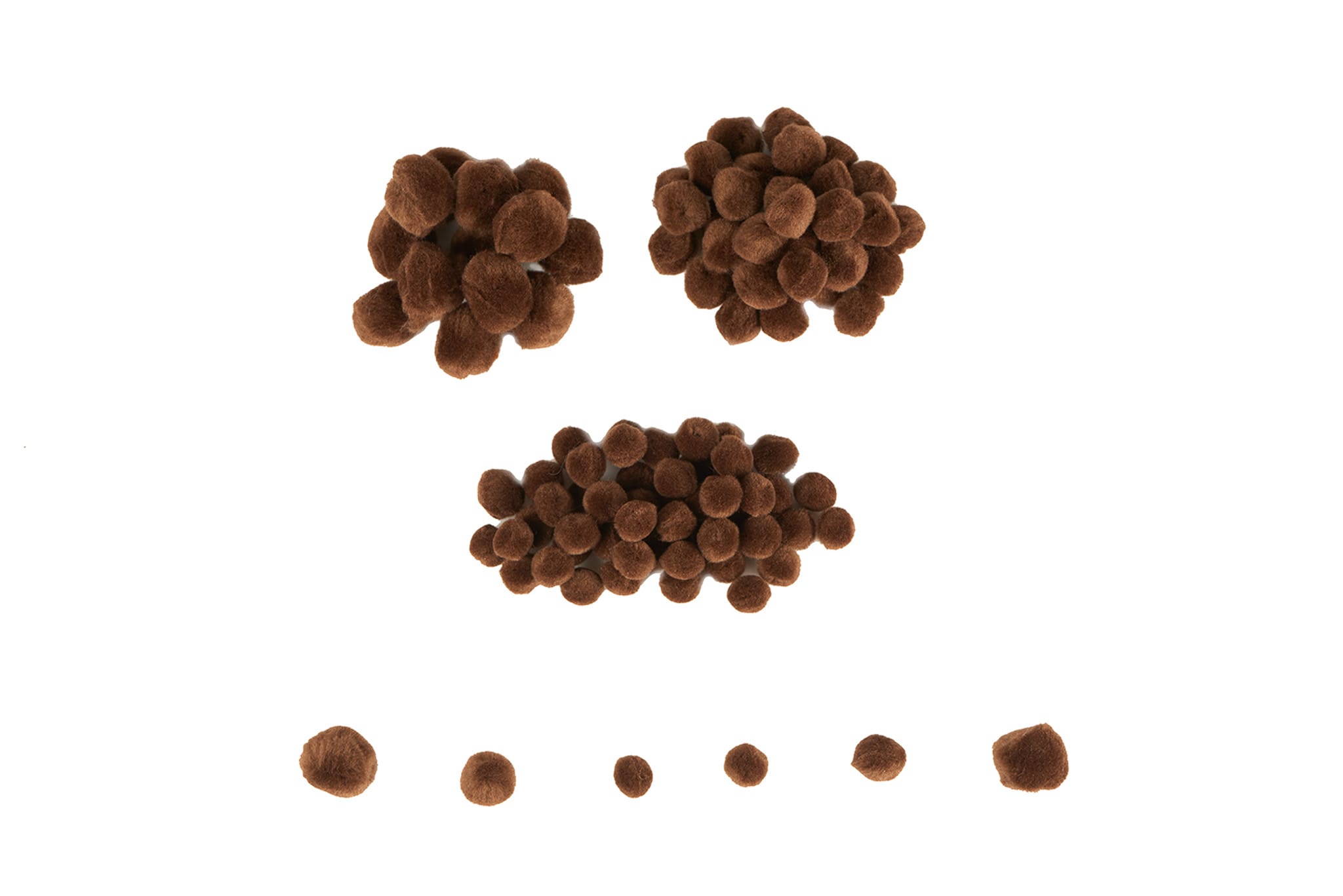 Each bag has 100 poms, 0.5 cm, 1 cm and 1.5 cm, in black, blue, brown,