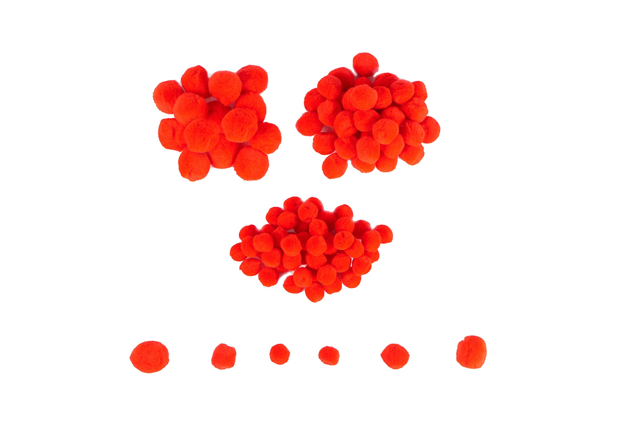 Each bag has 100 poms, 0.5 cm, 1 cm and 1.5 cm, in black, blue, brown,