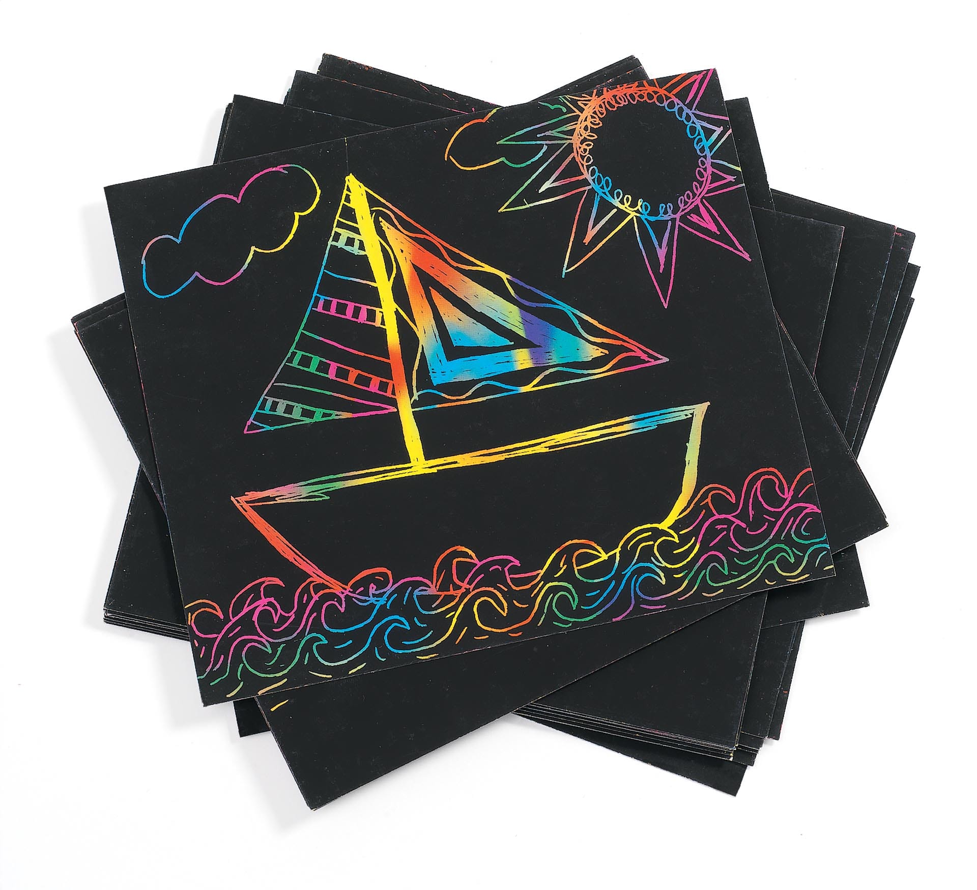 Uncover beautiful designs! Multicolour boards with black coating have an easy-to-scratch surface. Sturdier than the competition. Boards are 15.5 cm long x 15.5 cm wide and contain non-toxic paint. Use with easy-glide stylus, sold separately.