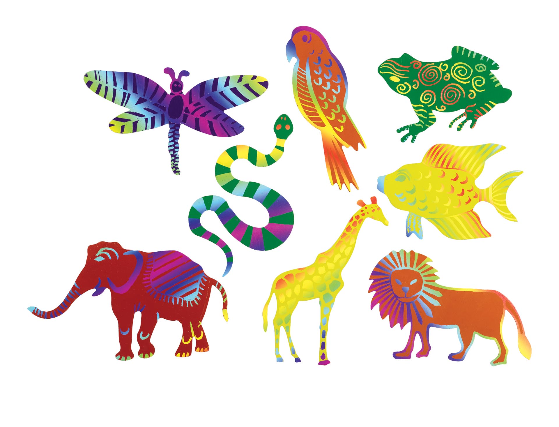 Create colourful animals as you scratch away a bright colour coating to see a multicolour rainbow pattern appear. Designs include colourful animals from nature: lion, elephant, dragonfly, frog, snake, giraffe, parrot and tropical fish.