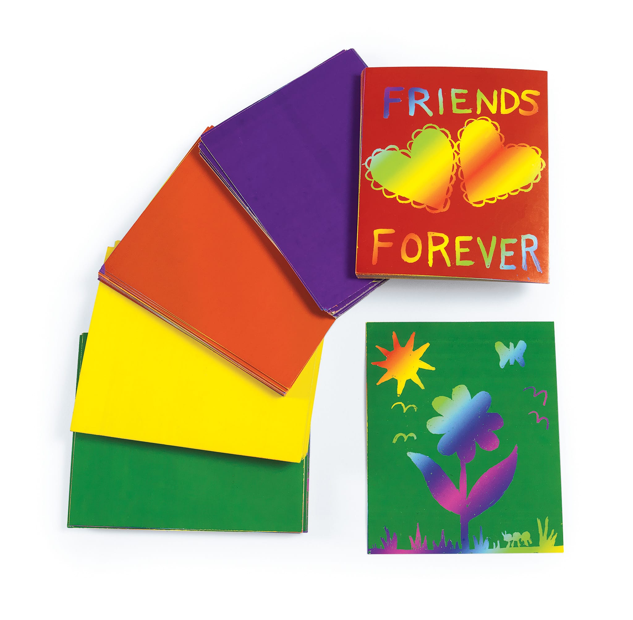 Sturdy cardstock boards have a bright colour coating that reveals a multicolour pattern underneath when scratched away.