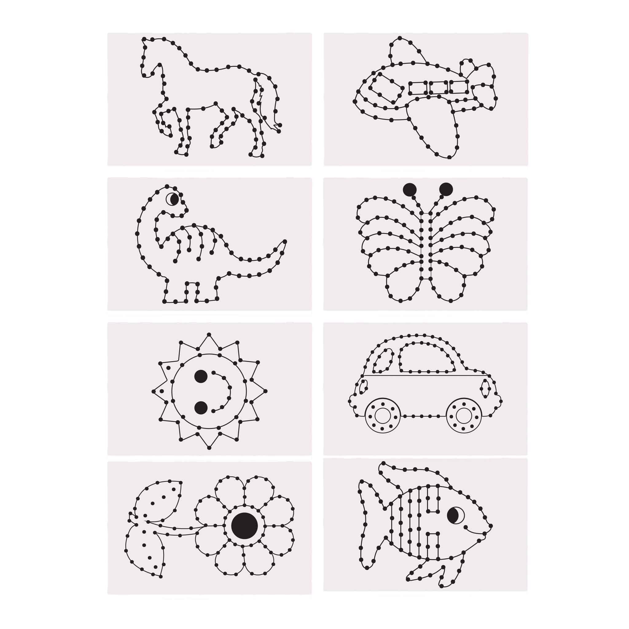 Encourage fine motor skills and creativity with this set of 48 sewing cards, each measuring 17 x 11 cm. Featuring 6 cards each of fun shapes like a horse, airplane, dinosaur, butterfly, sun, car, flower, and fish, these durable cardboard cards are perfect for lacing activities and early sewing practice. Ideal for classrooms, daycare centers, and at-home play!