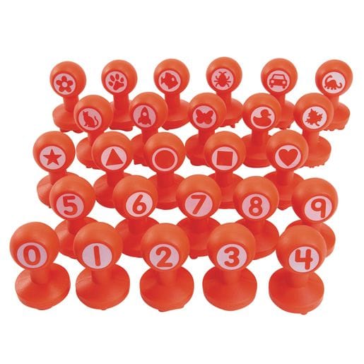 Includes numerals 0-9 and bug, butterfly, car, cat, circle, dinosaur, duck, fish, flower, heart, leaf, paw print, rocket ship, square, star and triangle shapes.