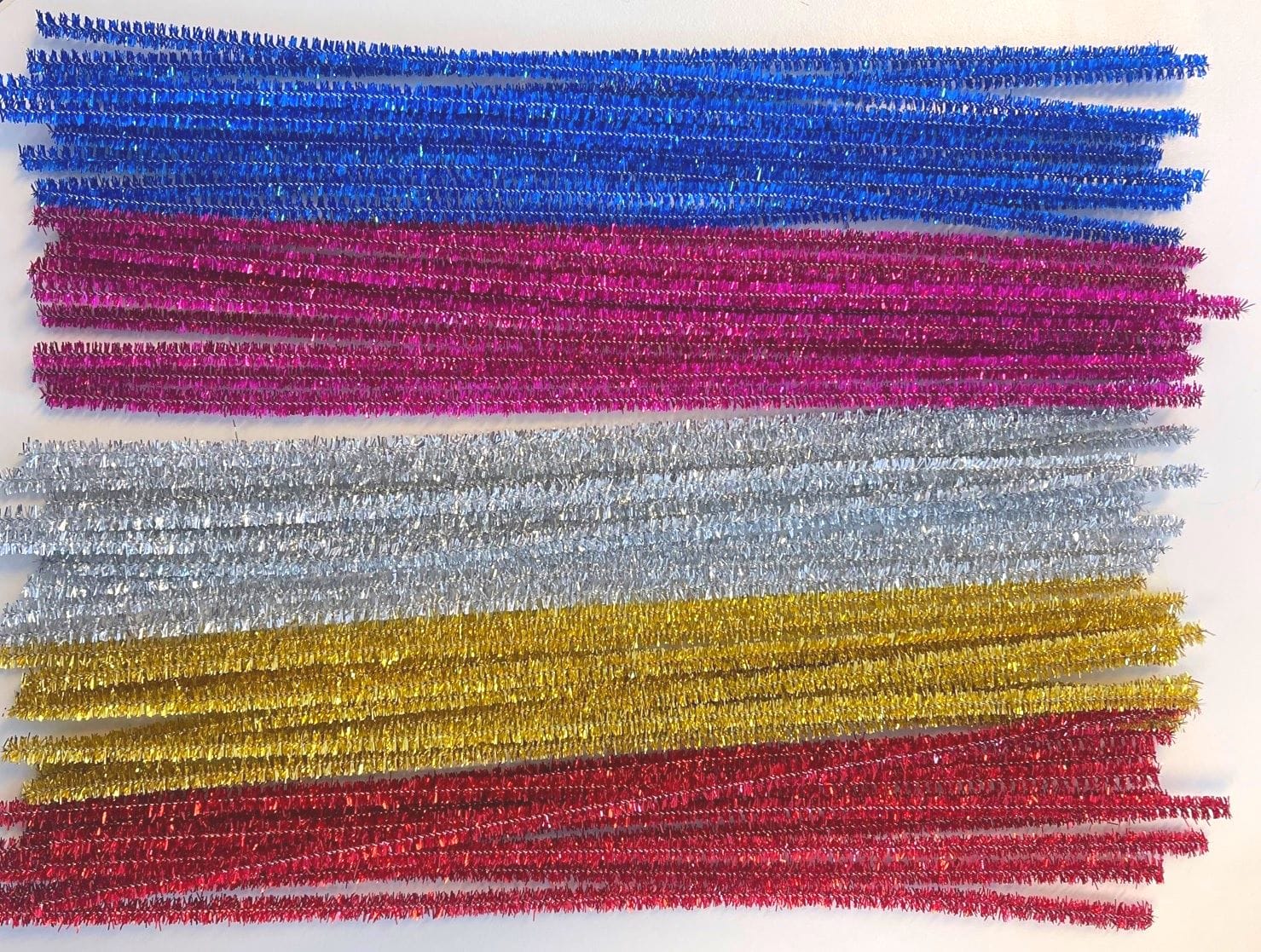Comes with 50 pipe cleaners, 10 of each gold, silver, purple, blue and red.