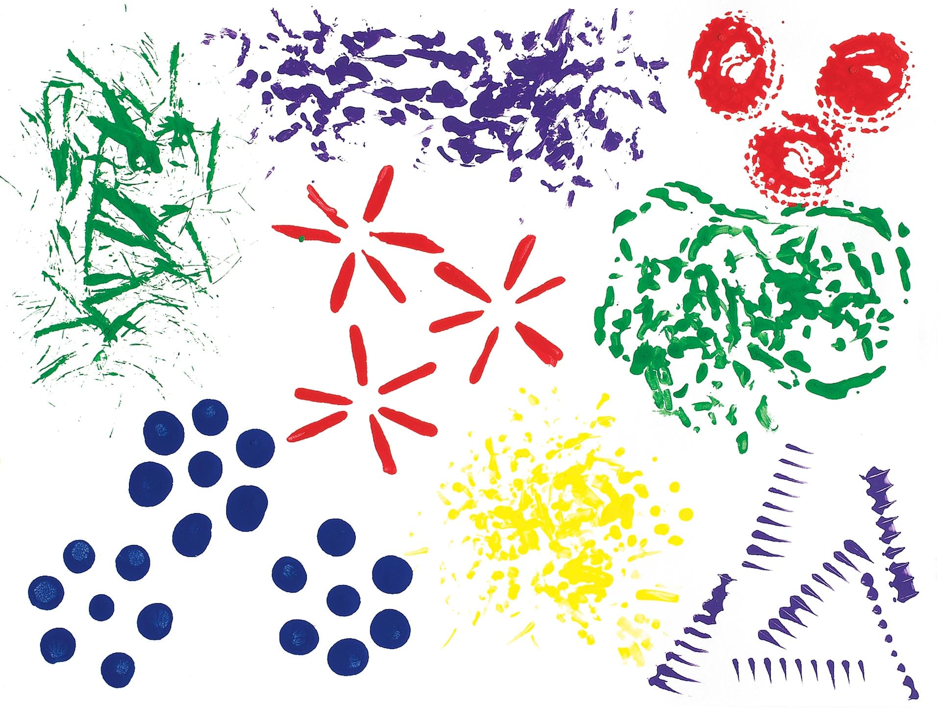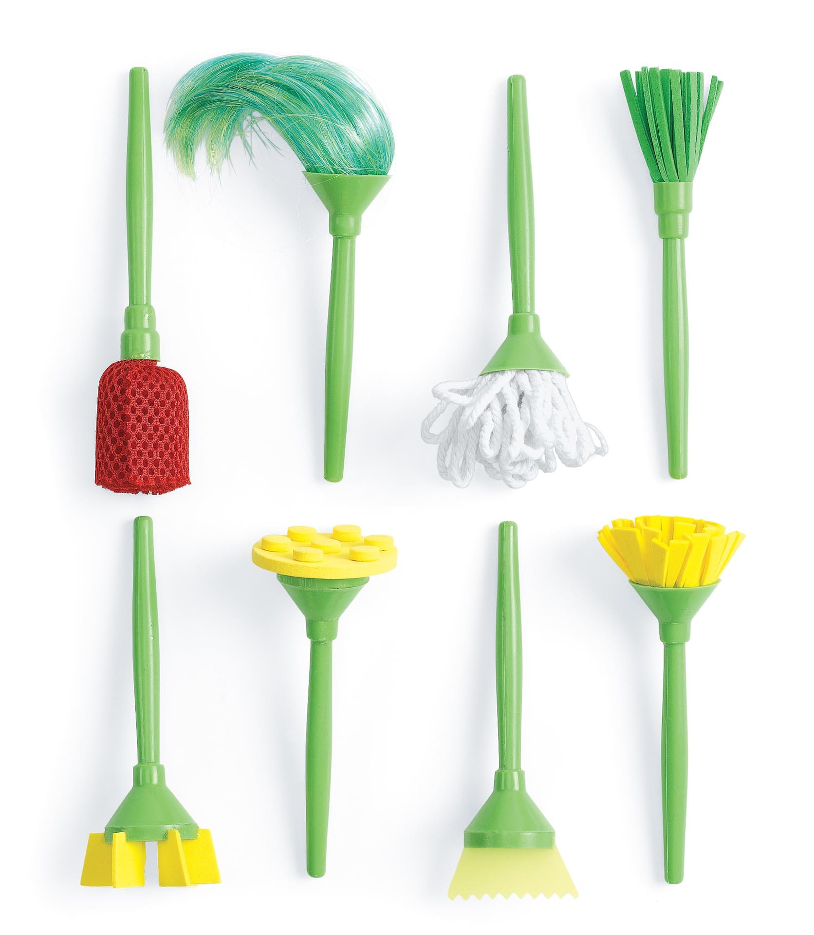 Dip, dab, dot, brush, twirl, print and scrape your way to amazing artwork with our exclusive wacky painting tools! Each tool makes a different design – your students will love experimenting with the looped rope, foam shape applicators, nylon netting, plastic "hair" and more! Have your young learners paint as they count, identify colors, discuss the textures of the brushes, and more. Tools are approximately 14 cm L each with solid plastic handles. Latex-Free. Ideal for homeschool or home school use.
